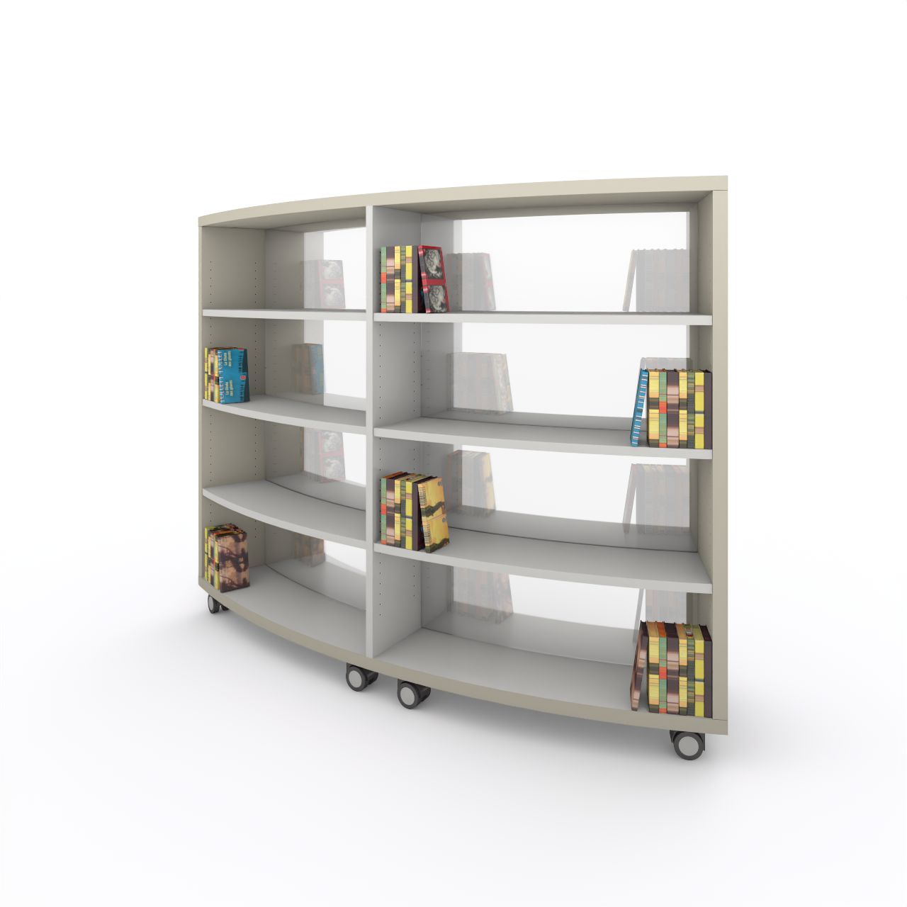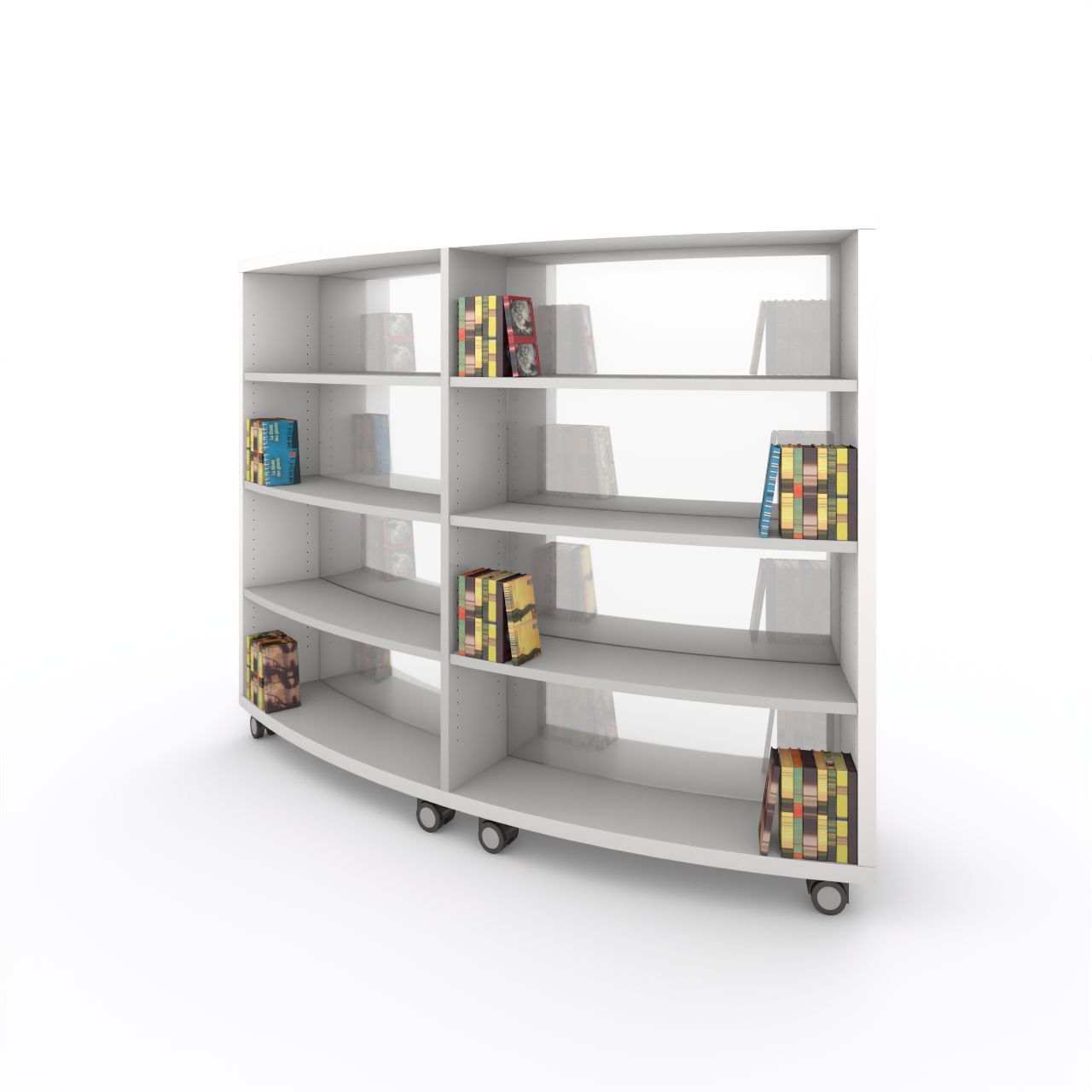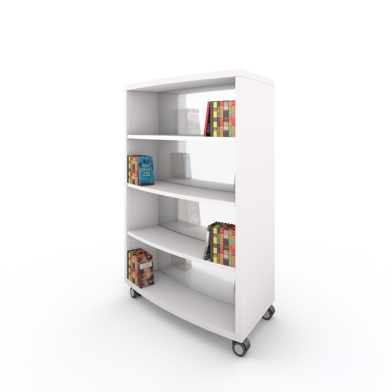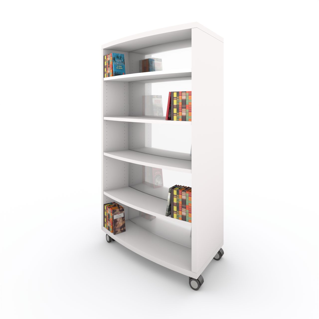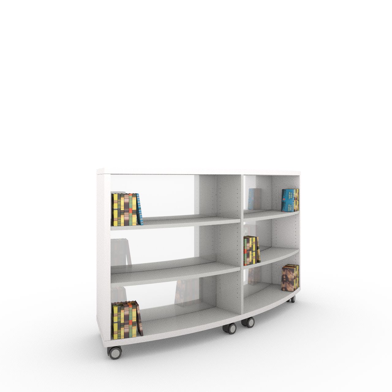 NOVA RUND mobile ist die gerundete Ausführung von NOVA WOOD mobile. Die Längsaussteifung von NOVA RUND mobile erfolgt mittels einer eingenuteten Acrylmittelwand, welche dem Regal eine transparente Leichtigkeit verleiht.