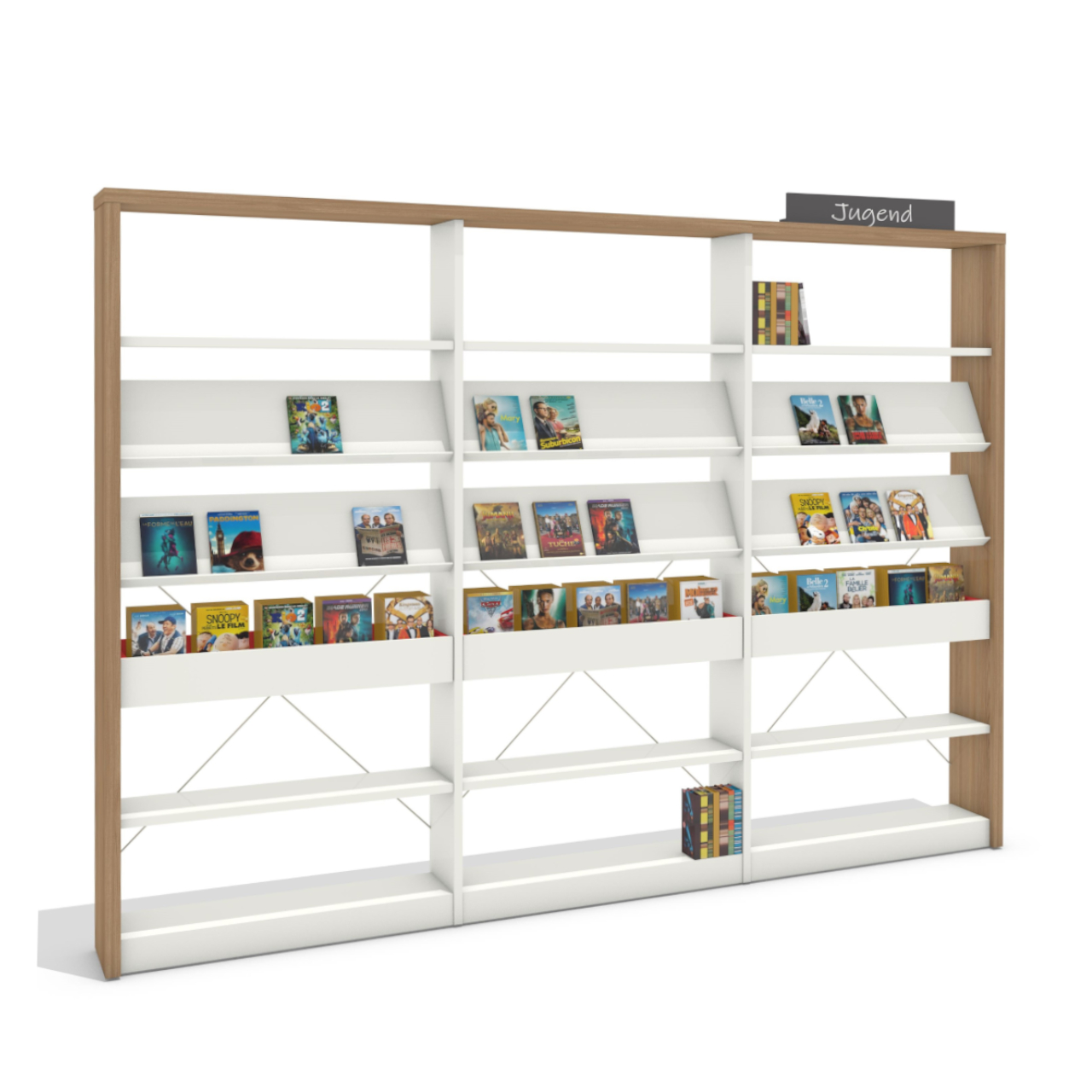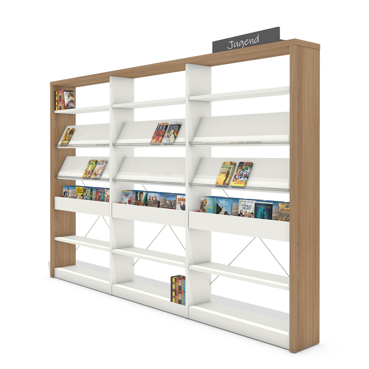 NOVA WOOD ist ein umweltfreundliches Regalsystem, das perfekt auf die Bedürfnisse und die intensive Nutzung in allen Arten von Bibliotheken abgestimmt ist. Das NOVA WOOD Regalsystem ist durch eine schlichte Linie mit einem klaren Look definiert. Die Holzaußenseiten bilden optisch einen Rahmen mit der oberen Abdeckplatte.