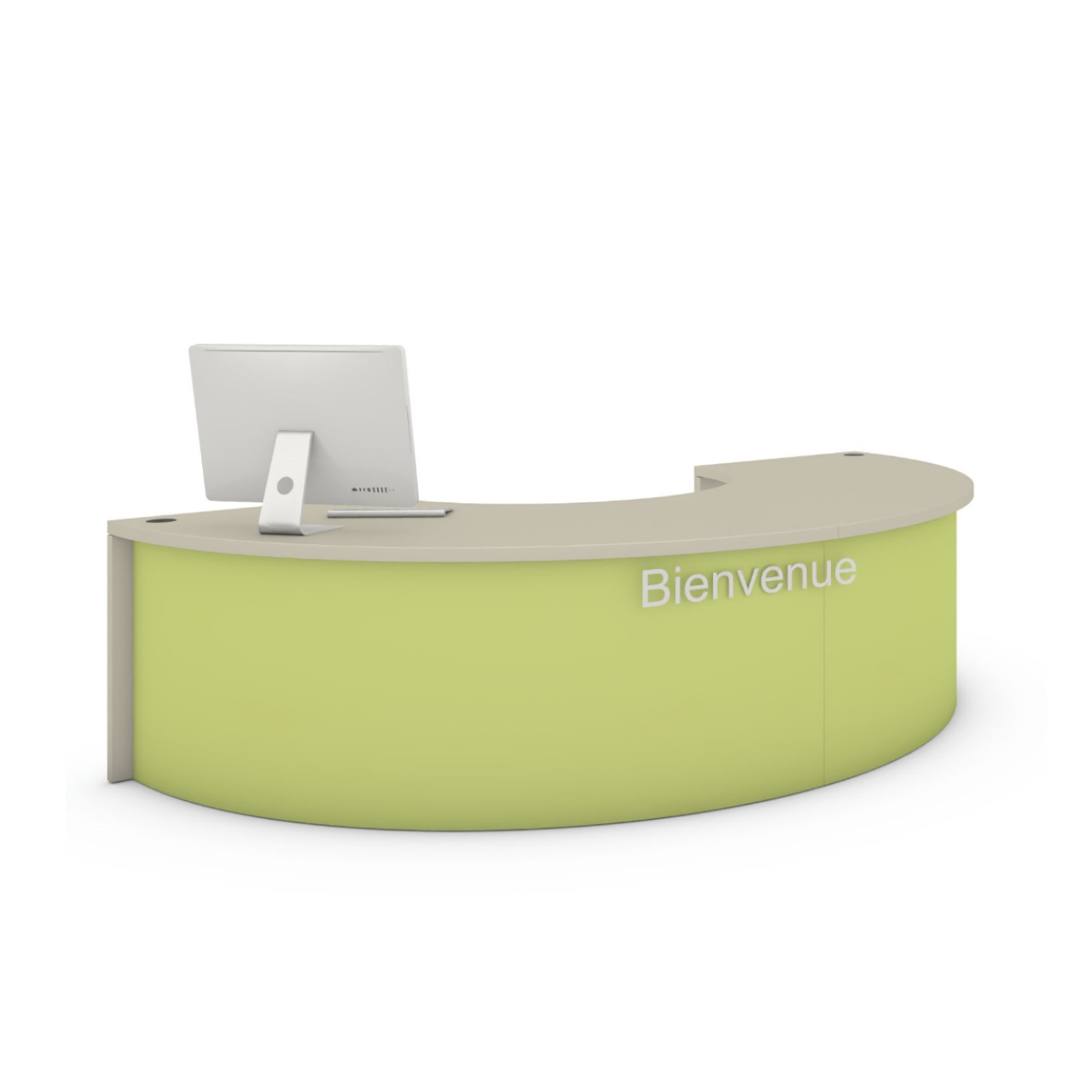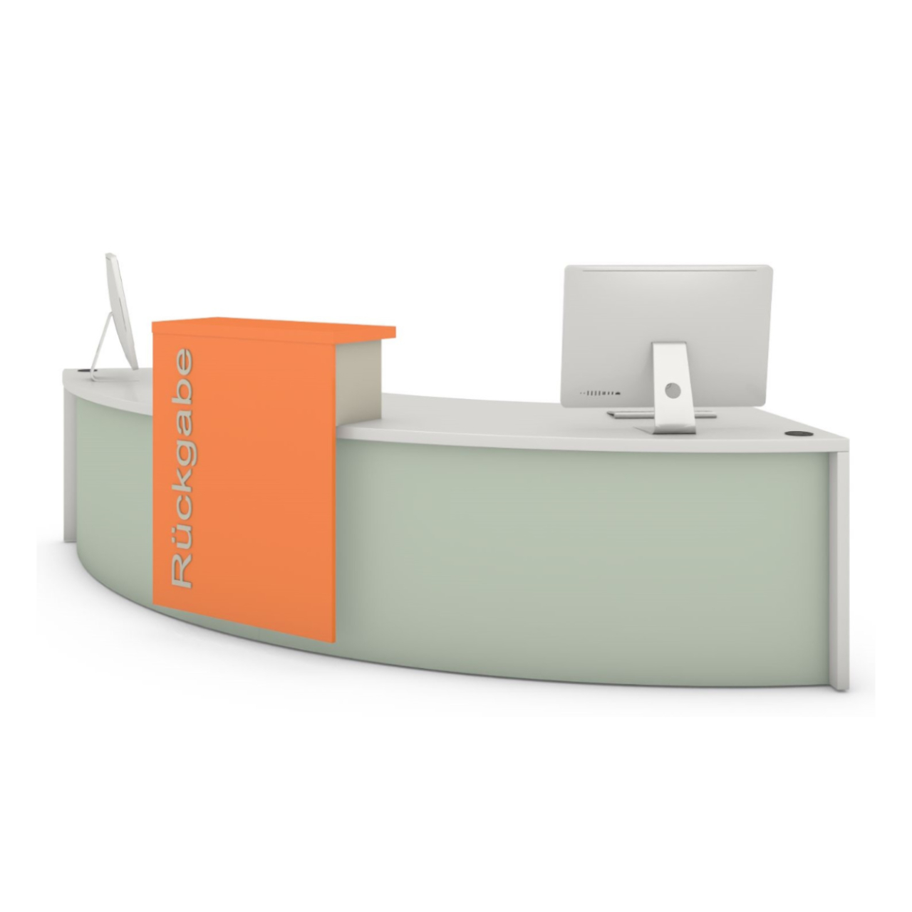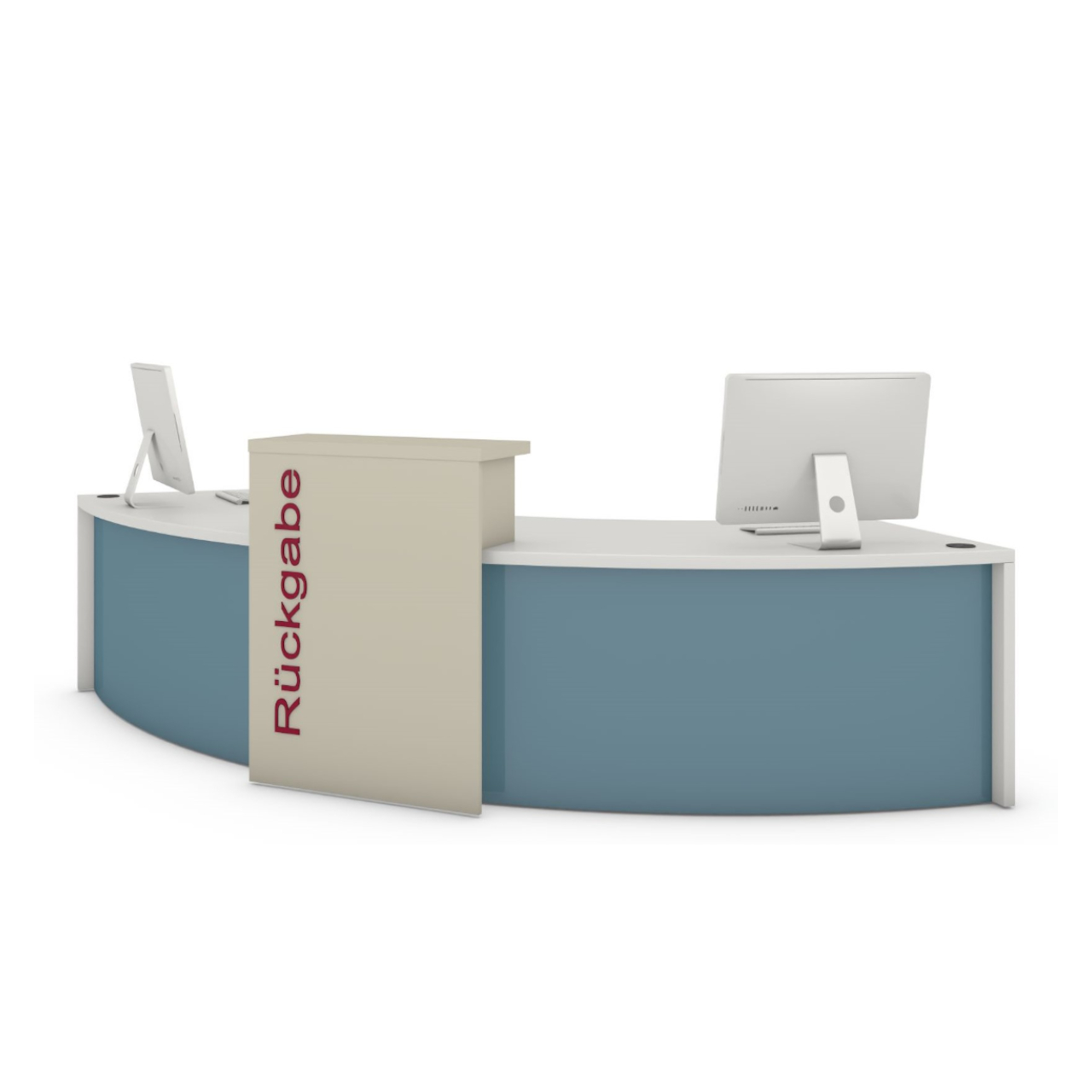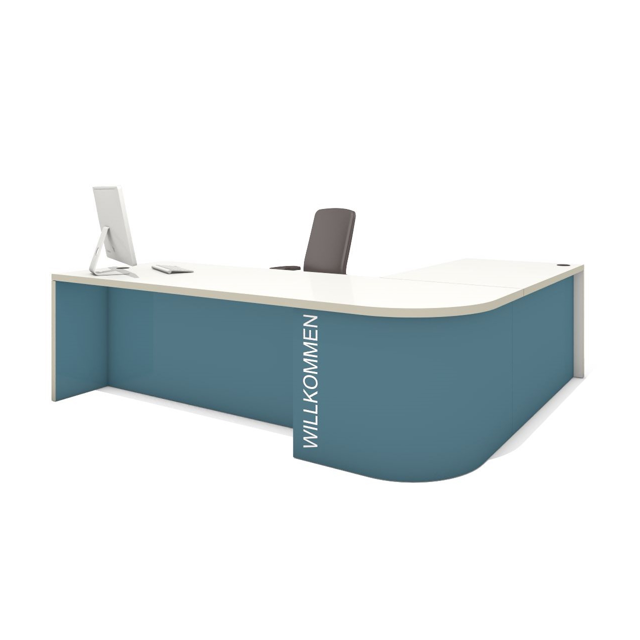 eine abgerundete Empfangstheke mit mehreren standard Winkeln und Konfigurationen: Radius 45°, 60°, 90° und 150° (60+90)