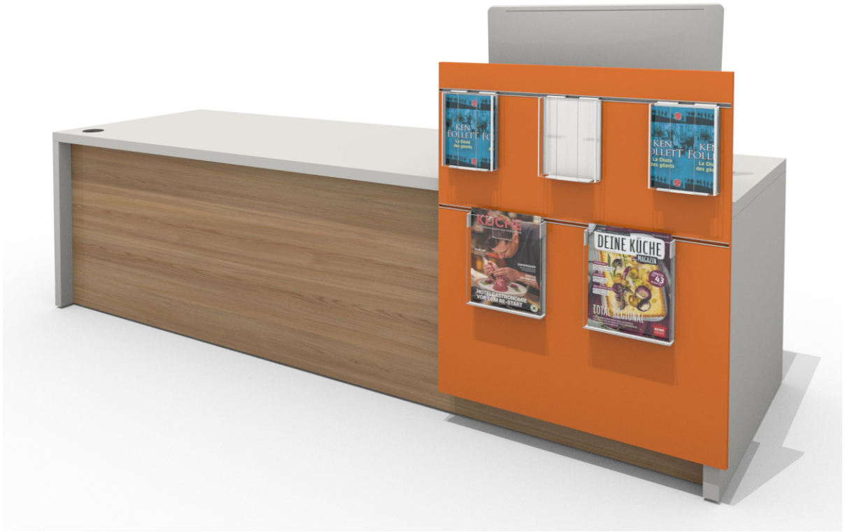 Der Folderaufsatz ist ein Präsentationsmodul, das an beliebiger Stelle auf der Empfangstheke platziert werden kann. Zwei treppenförmig angeordnete Fächer ermöglichen eine frontale Präsentation Ihrer Flyer, neuen Medien, Bücher oder CDs. Durch die rechteckige Form und die variable Länge kann der Folderaufsatz an alle Konfigurationen der BE Welcome Empfangstheke angepasst werden.