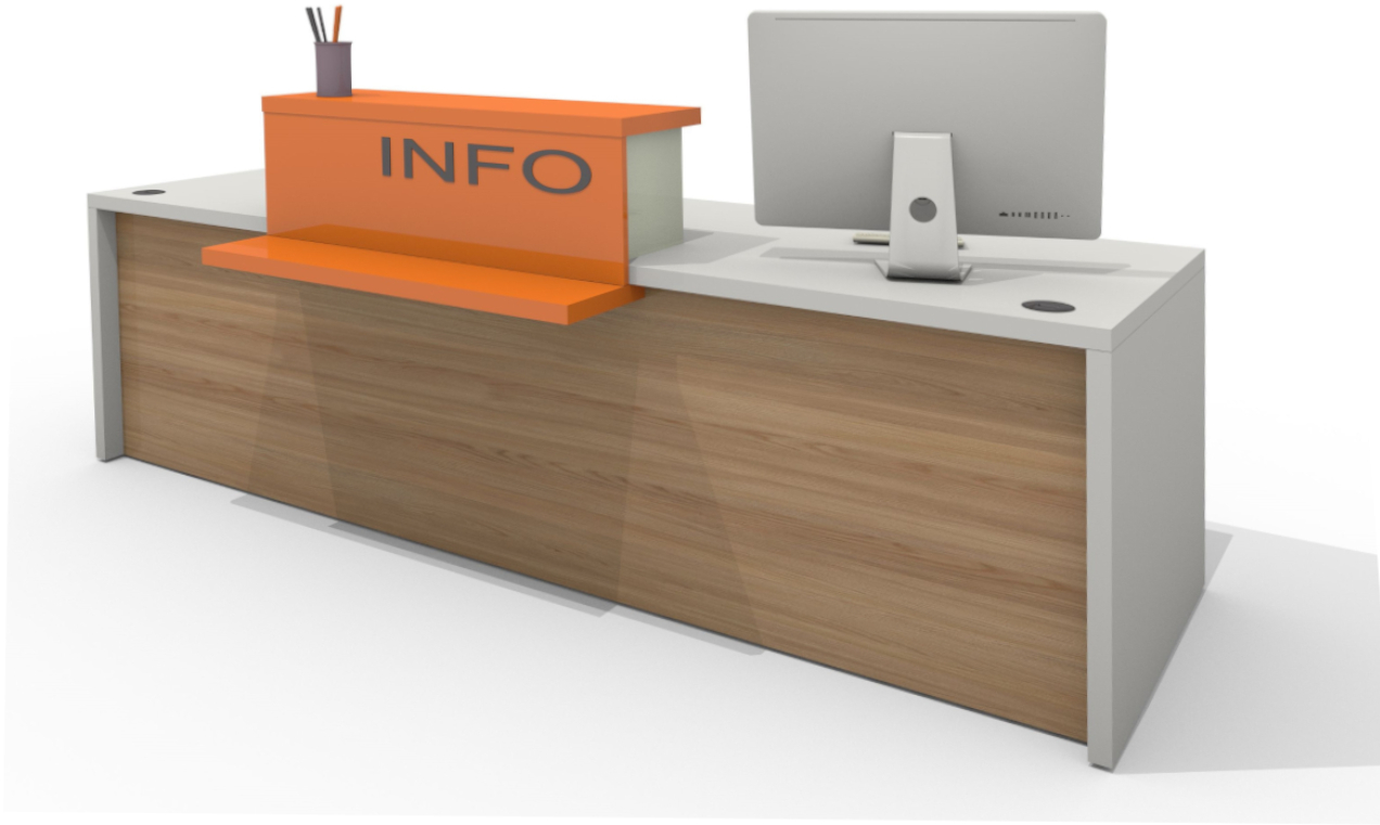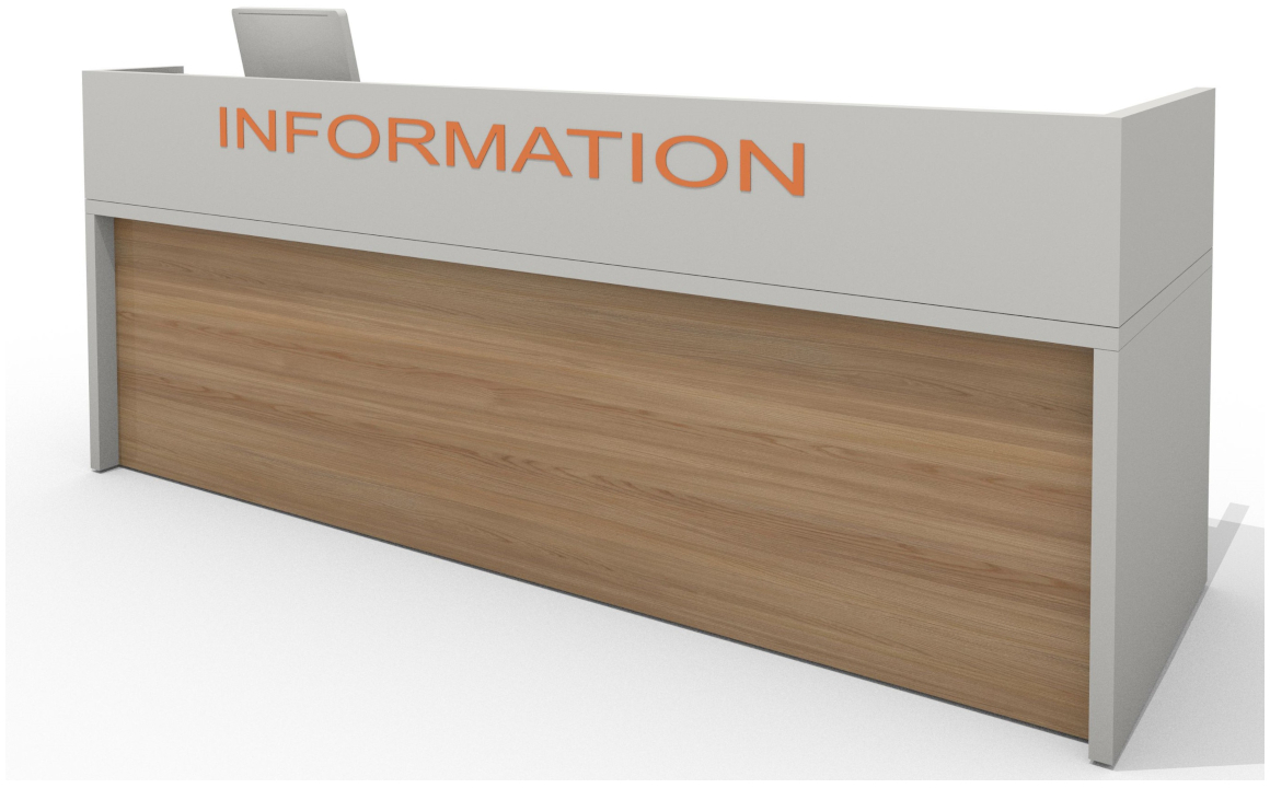 Der Thekenaufsatz als Sichtblende schafft einen privaten Raum für das Personal. Die horizontale Vorderseite, mit oder ohne Beschriftung ist in der gleichen Farbe wie die Oberseite der Emfangstheke gehalten. Die Tiefe der Seitenteile kann bei Bedarf an die Gesamttiefe der Empfangstheke angepasst werden.
